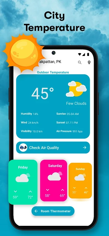 Следите за температурой в помещении и на улице с помощью этого удобного и умного термометра. Приложение показывает точную температуру, влажность, качество воздуха, прогноз погоды и другие параметры окружающей среды в режиме реального времени.