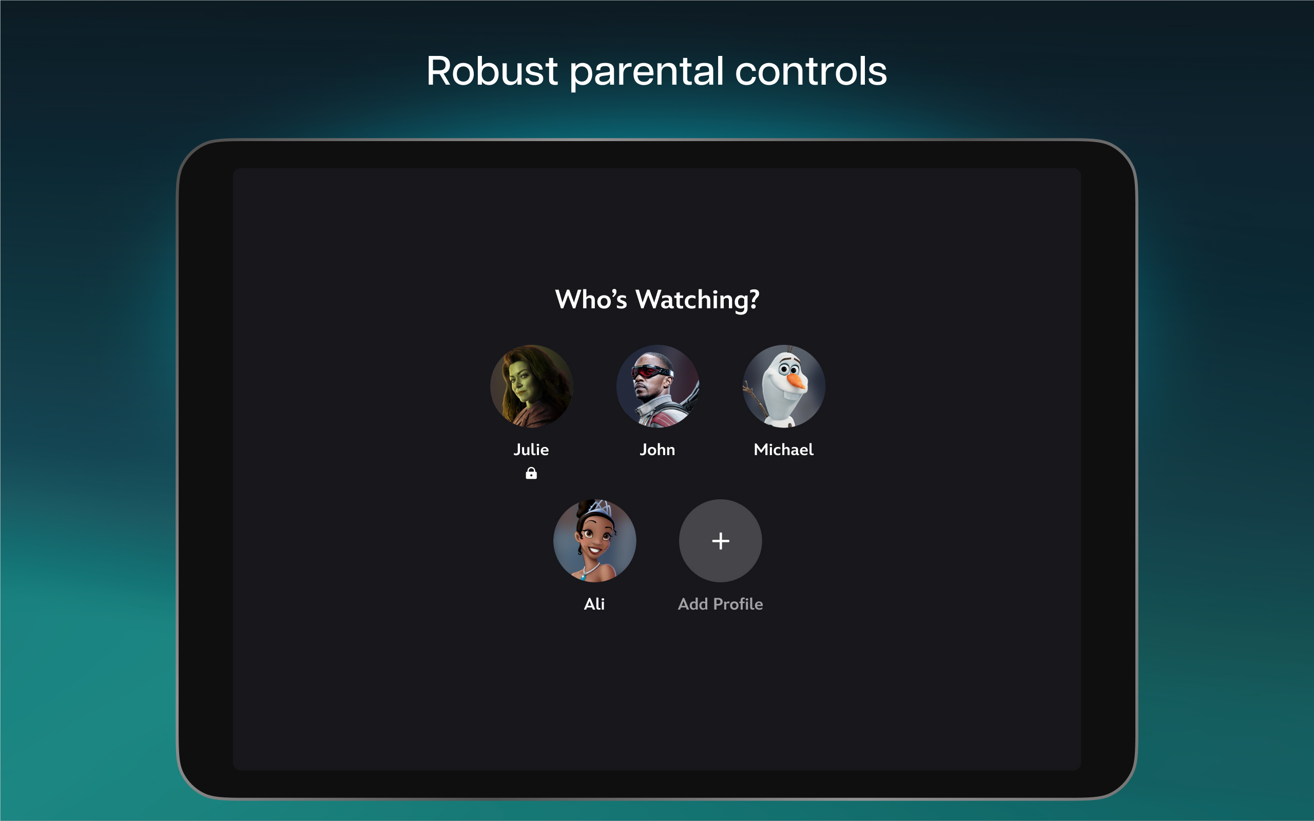 • Несколько функций родительского контроля, включая PIN-код профиля и выход с защитой от детей. Легко настройте параметры рейтинга контента профиля для просмотра, который подойдет каждому.