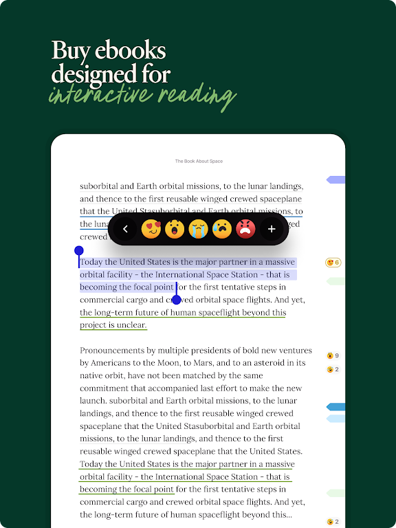 - Аннотируйте книги, добавляя основные моменты, примечания, комментарии и реакции прямо внутри книги.