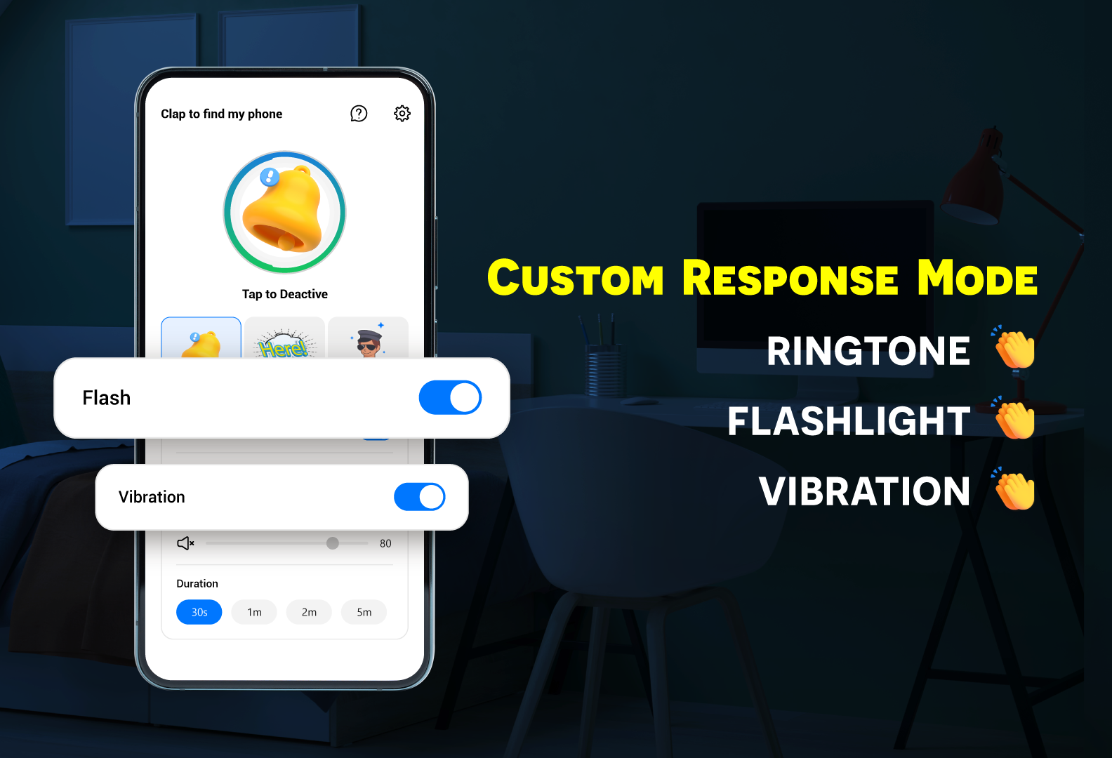 🔍 Приложение Хлопните, чтобы найти телефон предназначено для обнаружения звука хлопка и реагирования, чтобы помочь вам найти потерянный телефон. После того, как вы откроете это приложение и нажмете, чтобы активировать функцию хлопающего звонка телефона, оно будет внимательно прислушиваться к звуку хлопка или резкому свисту. Затем ваш потерянный телефон отреагирует звонком, миганием или вибрацией, что позволит вам легко найти его местоположение.