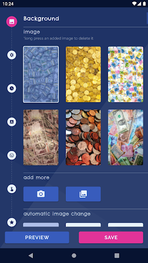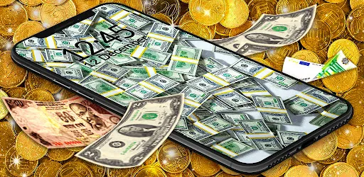 имеет несколько движущихся обоев с сияющими и блестящими изображениями, фоны золотых монет, HD-обои долларов, евро и рупий, несколько параметров настройки, такие как смена фона, рамки, анимация деньги, волшебное прикосновение, аналоговые часы, смайлики, ваше имя и многое другое, которые работают на экране блокировки, и все это