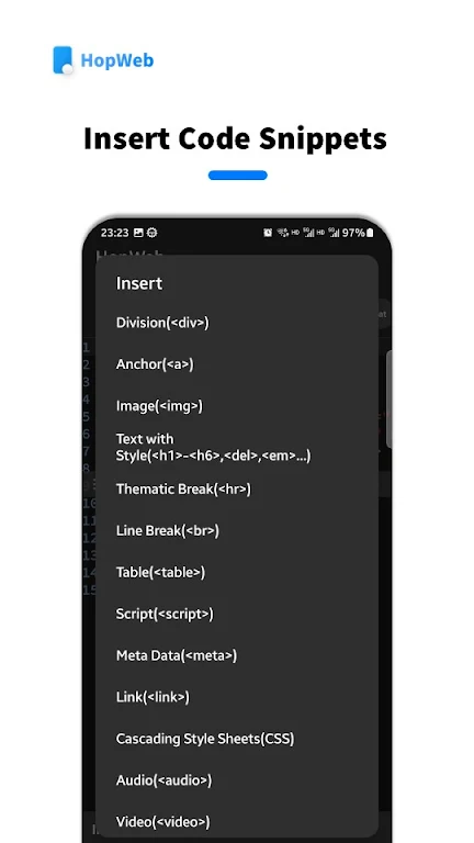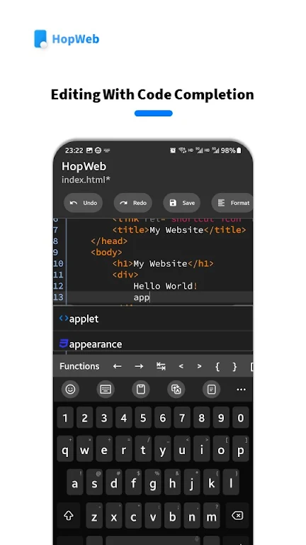For more, you can experience auto-completing code, formatting document, files manager, inserting code snippets, etc. in HopWeb.