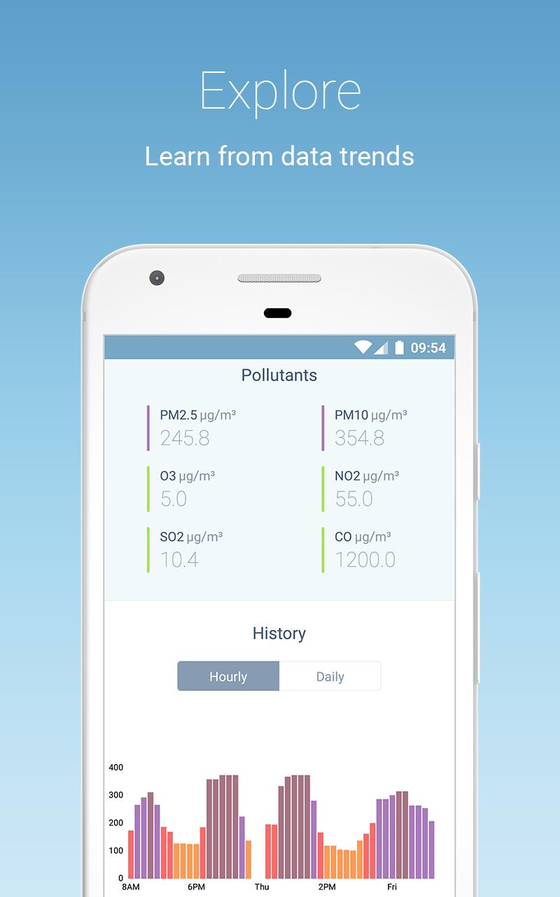 + Мониторинг данных по 6 ключевым загрязняющим веществам: отслеживайте текущие концентрации PM2.5, PM10, озона, диоксида азота, диоксида серы и угарного газа, а также тенденции содержания загрязняющих веществ в прошлом.