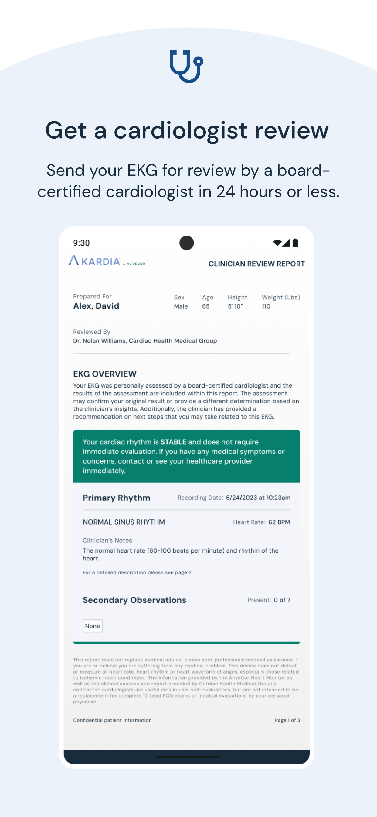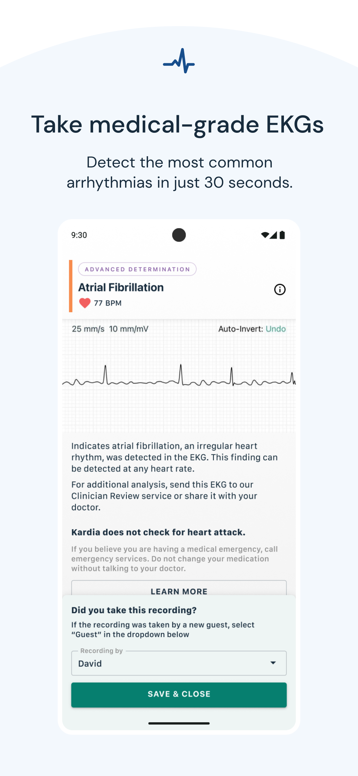 Снимайте ЭКГ медицинского уровня с помощью устройства Kardia в любое время и в любом месте - никаких пластырей, проводов или гелей не требуется. Получите немедленный результат с помощью мгновенного анализа Kardia нормальной, возможной фибрилляции предсердий, брадикардии или тахикардии. Для дополнительного анализа вы можете отправить запись своему врачу или одному из наших партнеров для клинической проверки кардиологом (только для США, Австралии) или физиологом кардиологом (только для Великобритании, Ирландии).