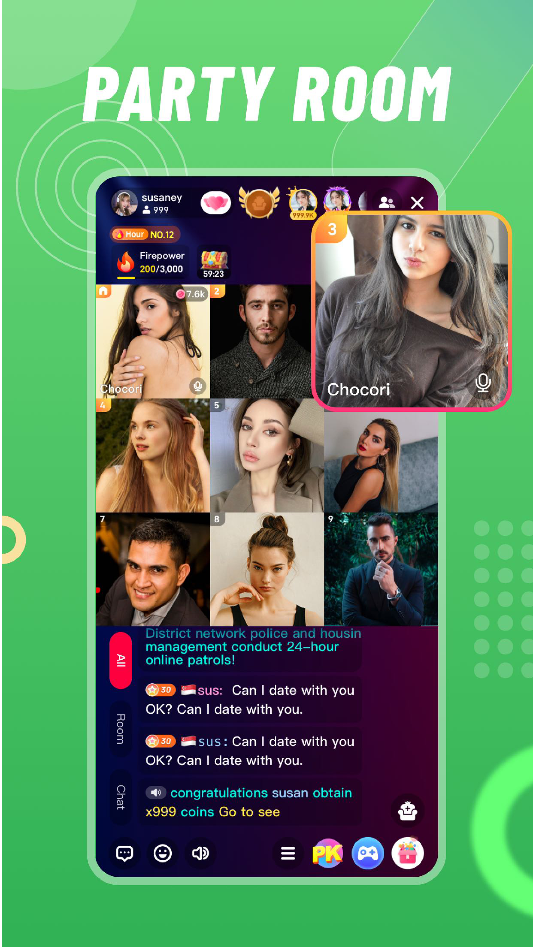 ● Вы можете создать комнату для вечеринок, вмещающую до 4, 6, 9 участников, пение, общение, изучение иностранного языка с друзьями и поклонниками.