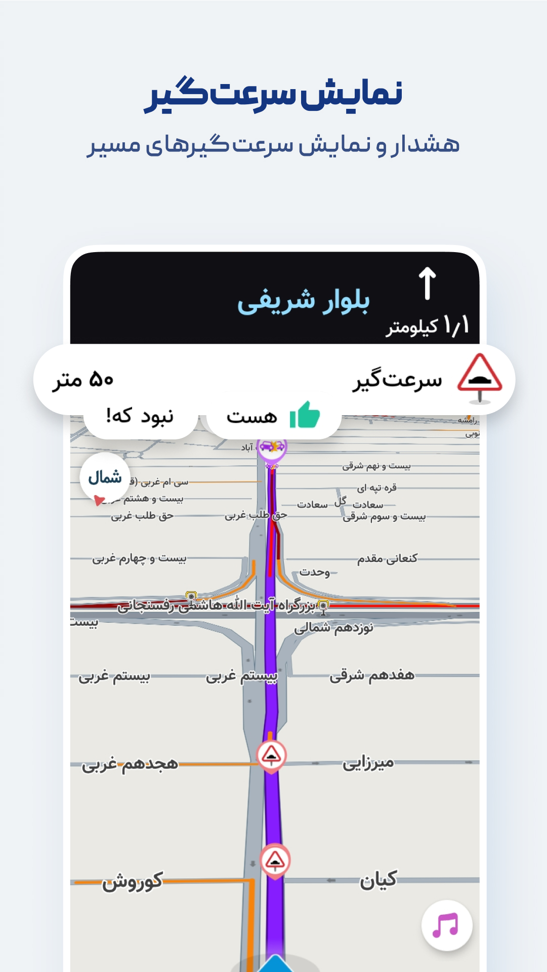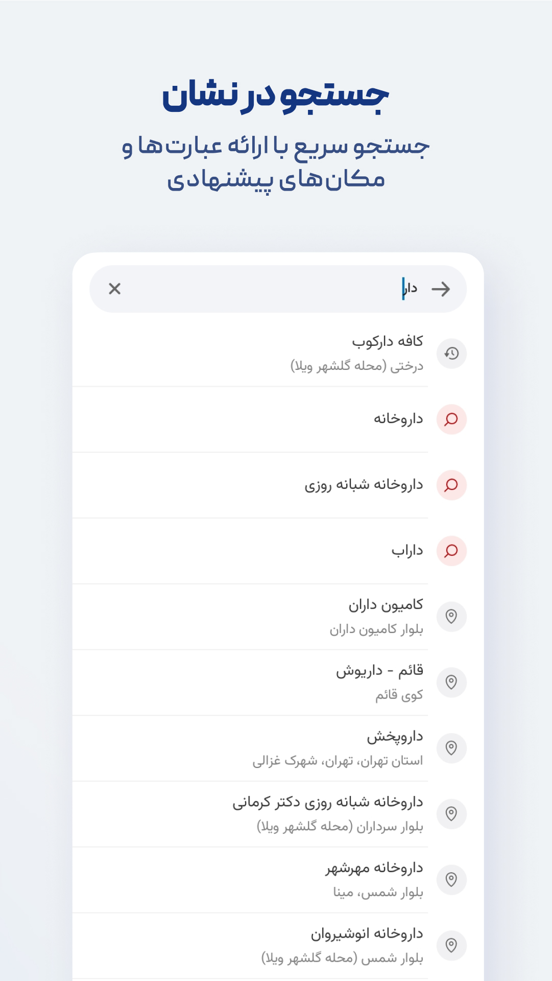 Используя GPS и принимая во внимание онлайн-трафик, аналогичный иностранному, система поиска карт и маршрутов предложит вам самый быстрый и наименее загруженный маршрут и сообщит вам о полиции по пути, чтобы предупредить вас о приближении к камере контроля скорости. Такие возможности, как отображение загрязнения воздуха в городах, где есть станции измерения загрязнения воздуха, объявление лежачих полицейских, маршрутизация с учетом планов дорожного движения и контроля загрязнения воздуха, комбинированные маршруты автобусов и метро, маршруты мотоциклов и т. д., стали знаковыми для многих иранских пользователей. Водители интернет-такси (Snap и Tapsi) имеют множество особых преимуществ по сравнению с другими службами карт и маршрутизаторов.
