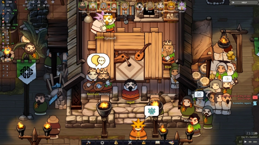 Your peasants rely on their daily wages to lead fulfilling lives. Adjust wages and market prices for food and ale to keep the populace motivated and encourage or discourage migration. But be wary of who you welcome, as different cultures often clash. You can leverage this friction to your advantage at times, but if the masses take issue with your family's heritage, hiring more guards may ensure your longevity.