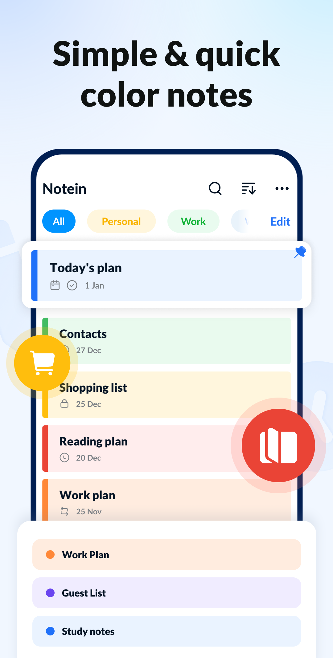 Блокнот, заметки и списки - Notein — отличное приложение для заметок с виджетом в Android. Создавайте заметки на цветном фоне, чтобы легче было их различать.