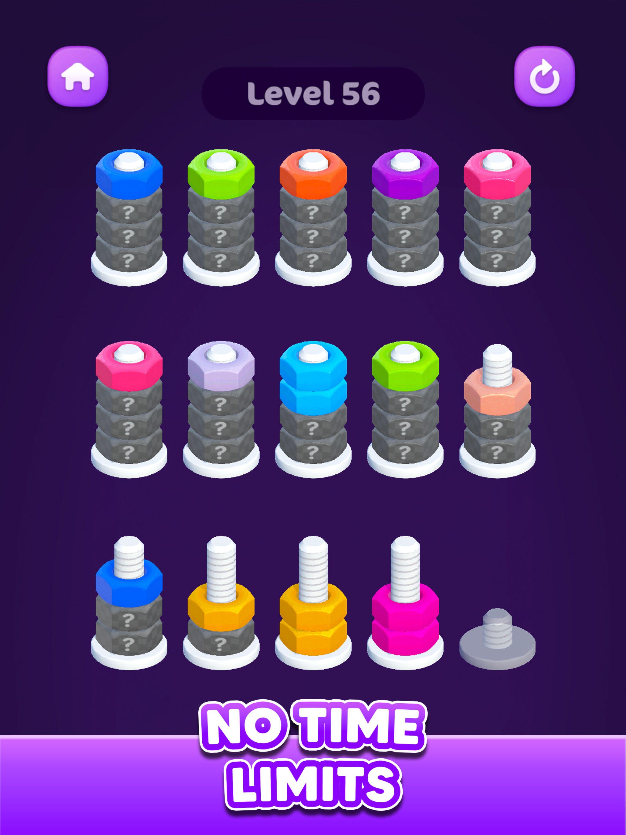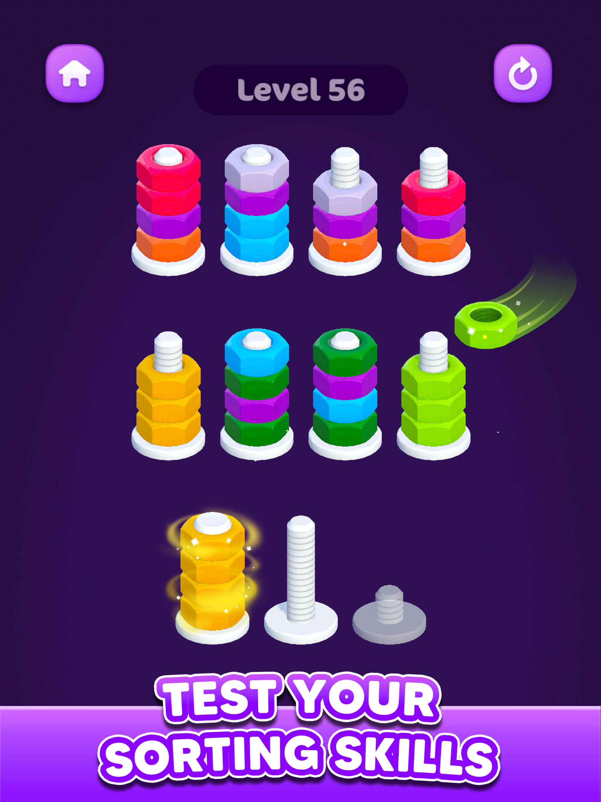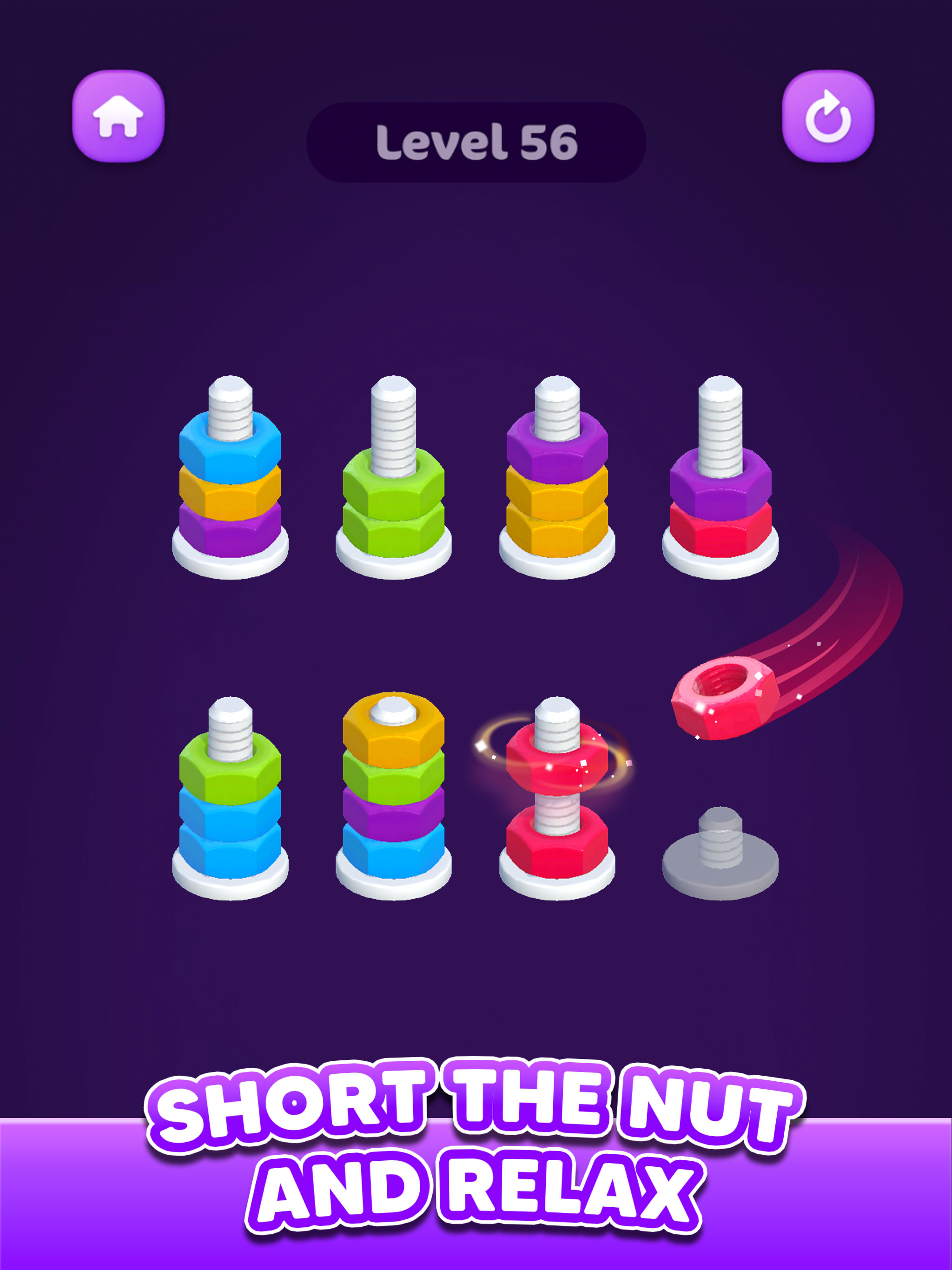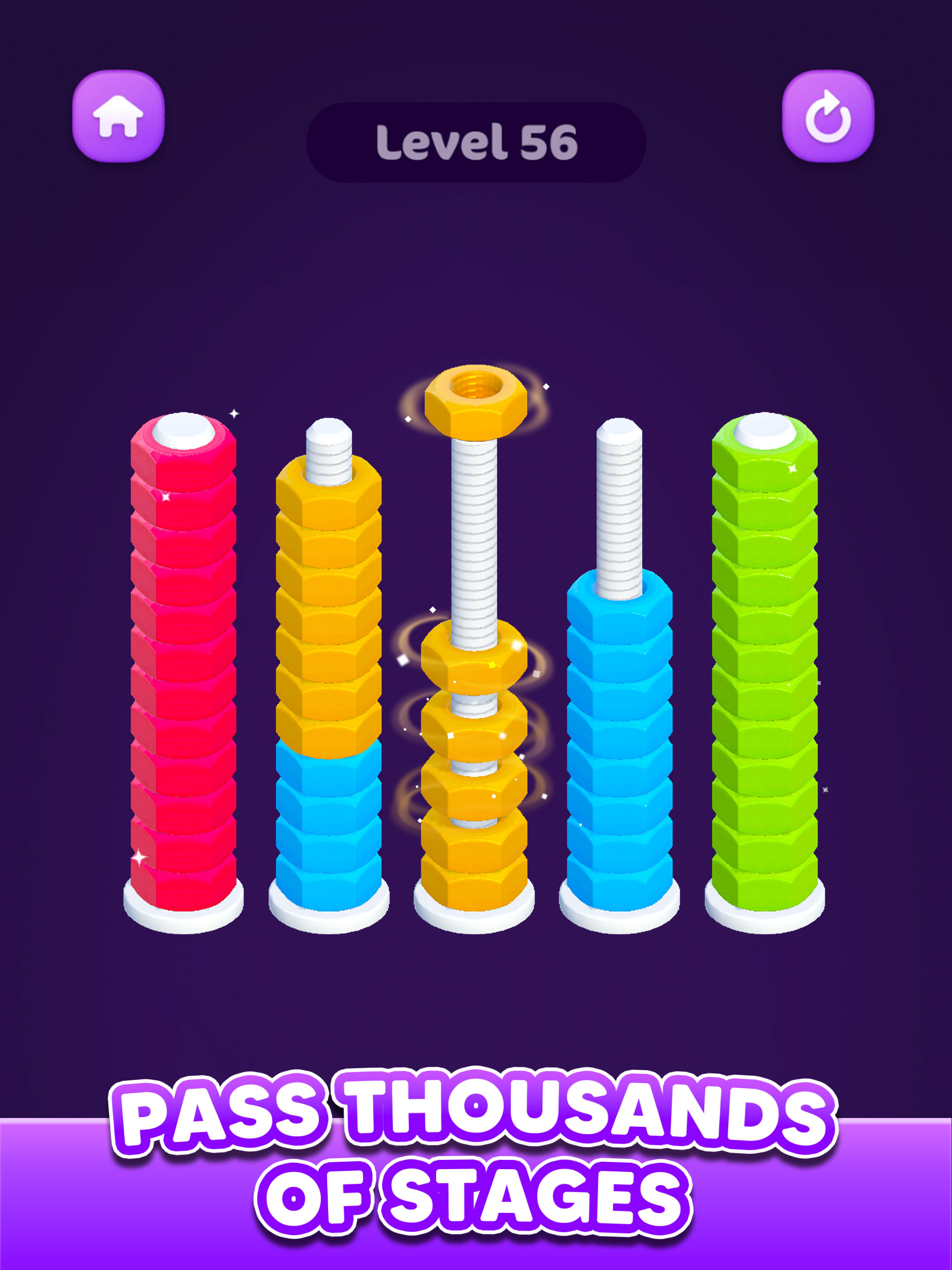 Nut Sort предлагает игрокам множество уровней с возрастающей сложностью. Каждый успешно завершенный уровень приносит удовлетворение и ощущение прогресса. Однако в игре отсутствует система достижений или дополнительные элементы кастомизации, что могло бы увеличить ее долгосрочную привлекательность. Несмотря на это, постепенное усложнение уровней мотивирует продолжать игру.