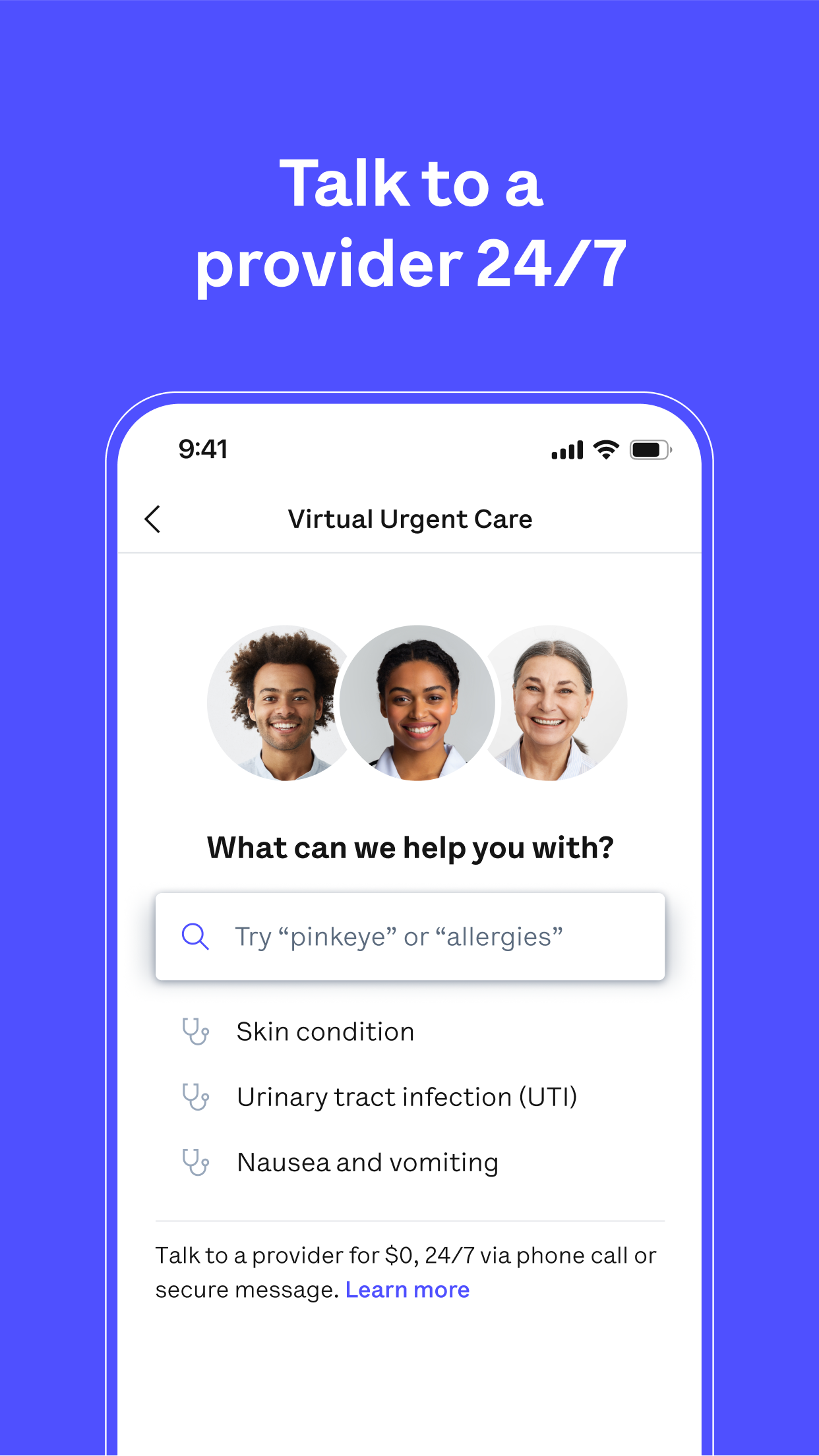 • Обращайтесь к поставщику услуг круглосуточно и без выходных с помощью Virtual Urgent Care.