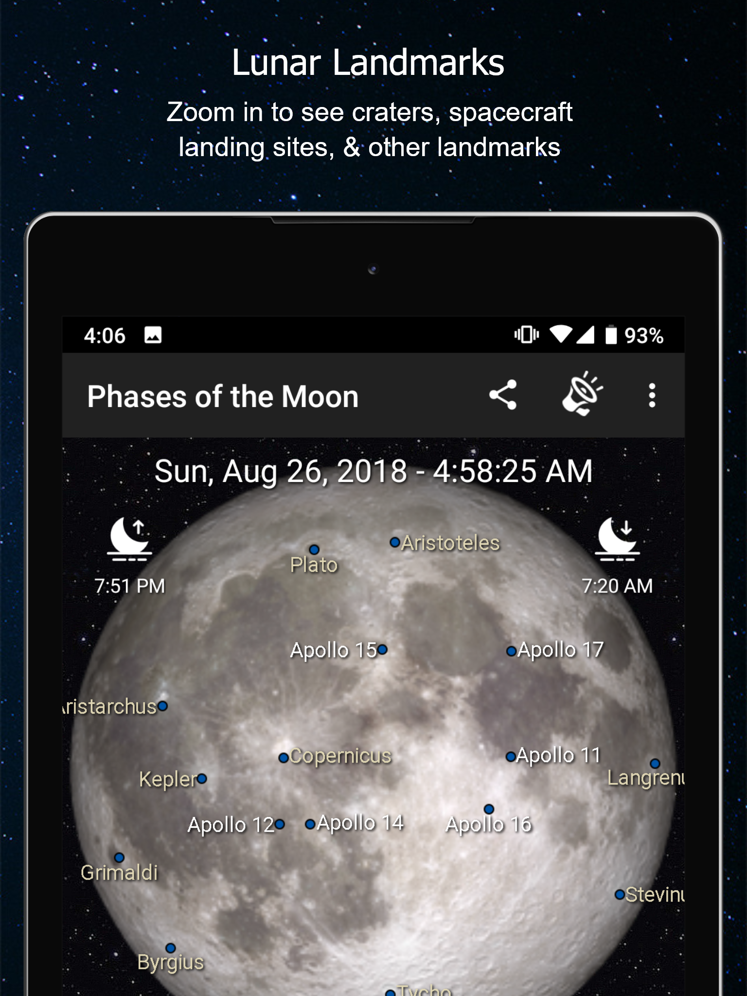 Увеличивайте масштаб Луны двумя пальцами, чтобы видеть полный лунный атлас с местами посадки космических кораблей, морем и большими кратерами.