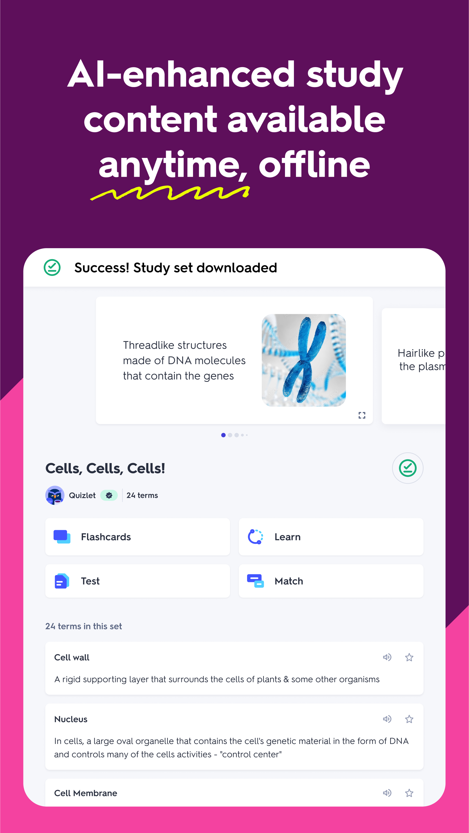 Quizlet — наилучшее приложение с карточками, которое помогает учиться и запоминать. Вы легко можете создать собственные карточки или выбрать уже готовые. Скачайте приложение уже сегодня и присоединитесь к более чем 60 миллионам учащихся, которые проходят курсы в Quizlet. Подпишитесь на Quizlet Plus, чтобы учиться по решениям из учебников, без рекламы, с доступом в режиме онлайн и множеством других премиум-функций, которые помогут вам учиться эффективнее.