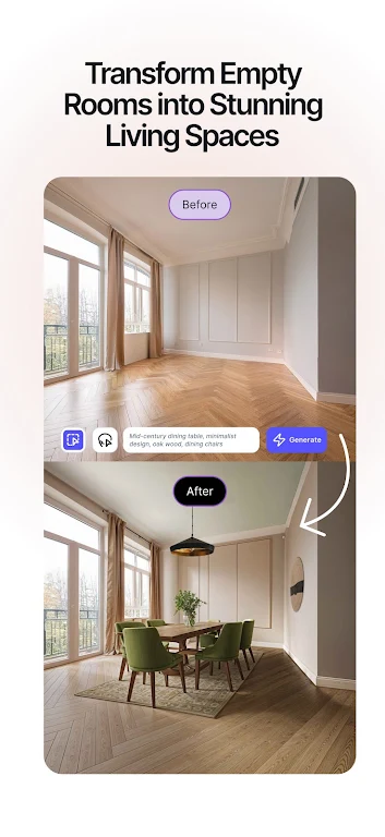 Откройте для себя будущее домашнего дизайна и дизайна интерьера с помощью Renovate AI, вашего универсального решения для создания потрясающих фотореалистичных интерьеров и экстерьеров. Планируете ли вы полный домашний декор, дизайн комнаты или ландшафтный дизайн, наши передовые технологии сделают это проще, быстрее и умнее. Renovate AI поможет вам реализовать дизайнерские идеи, которые превратят ваше видение в реальность.