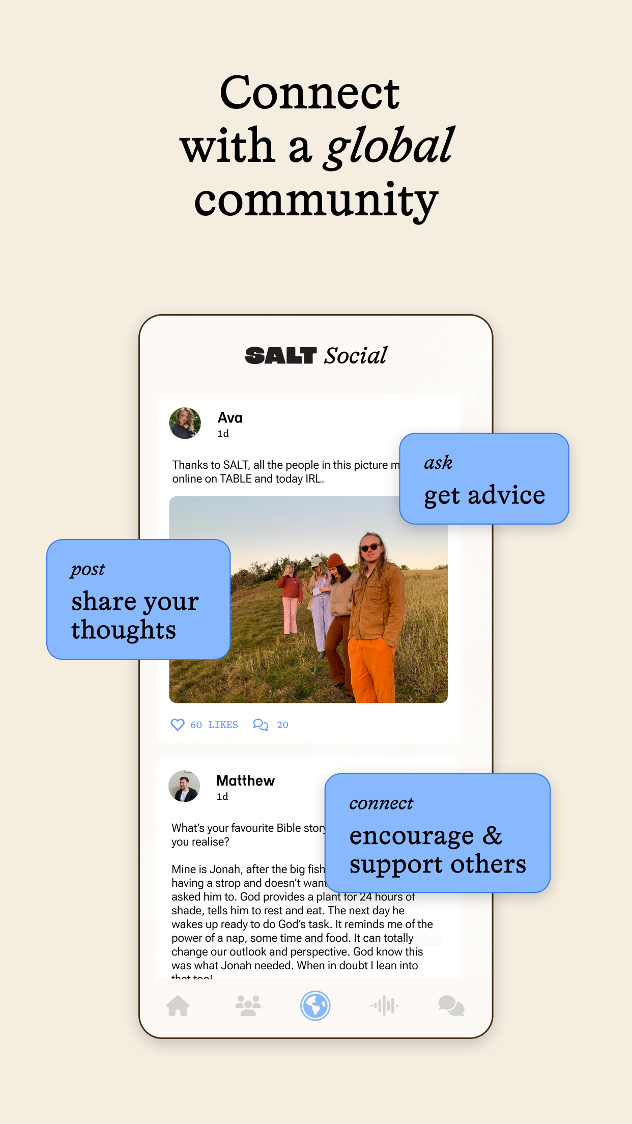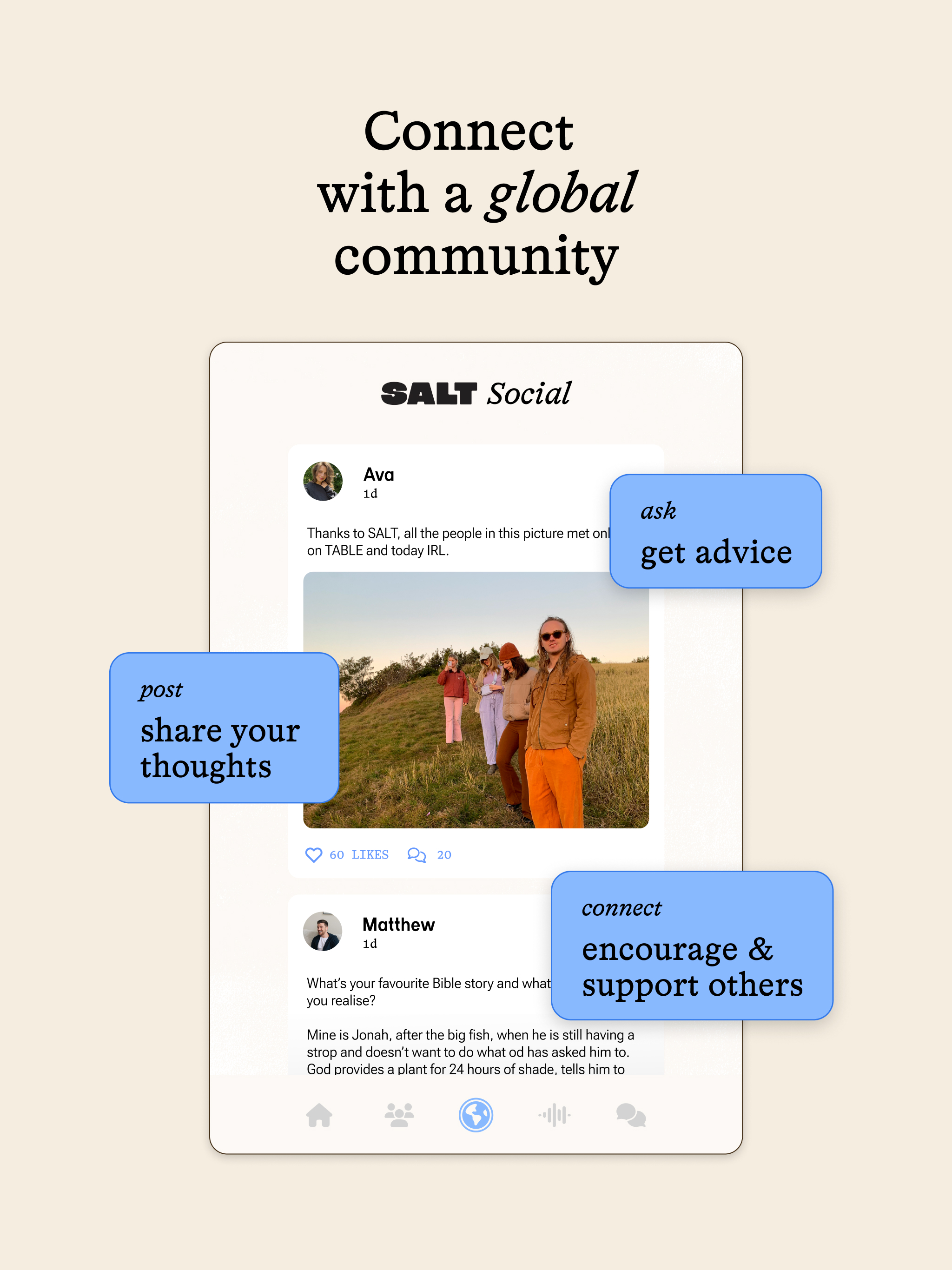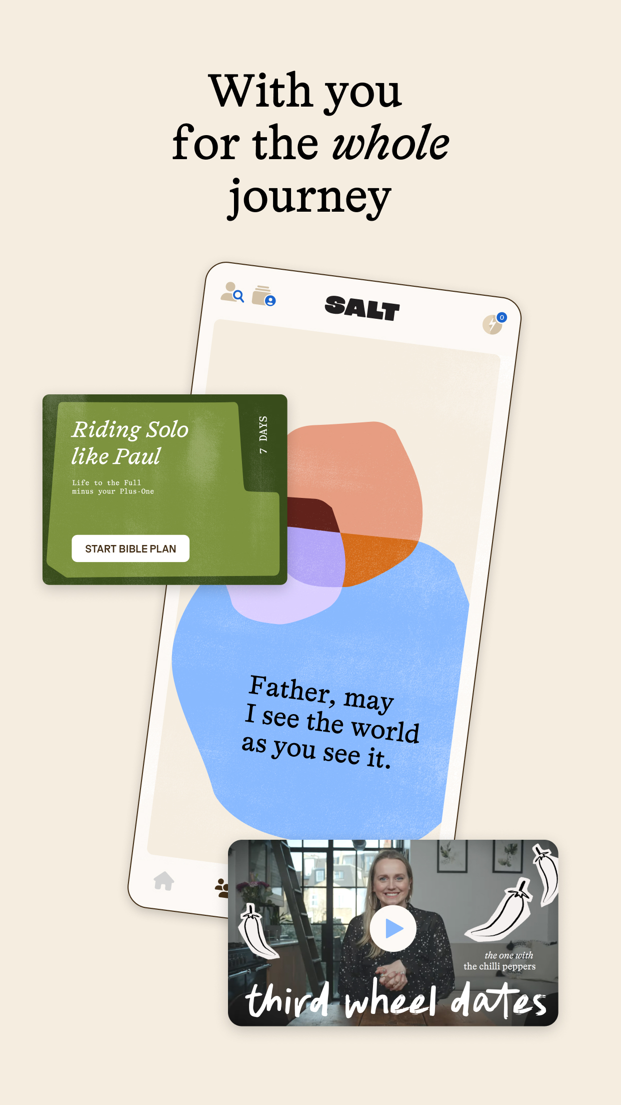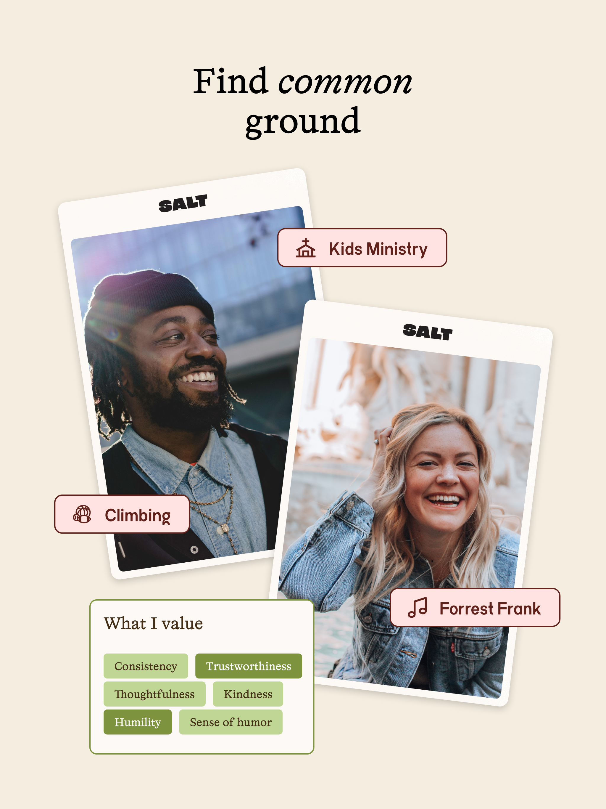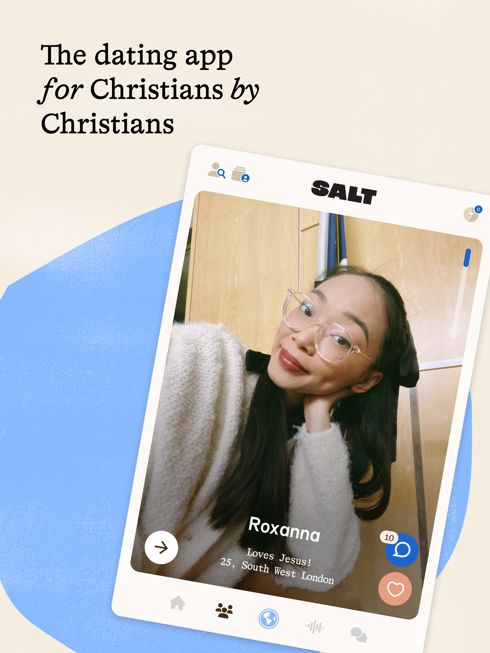 SALT — это отмеченное наградами христианское приложение для знакомств, о котором пишут Vogue, GQ, BBC, Church Times и многие христианские СМИ. СОЛЬ создана христианами для христиан. Присоединяйтесь к 1 миллиону одиноких христиан - присоединяйтесь, знакомьтесь, знакомьтесь и отправляйте сообщения одиноким христианам бесплатно или подпишитесь на дополнительные функции.