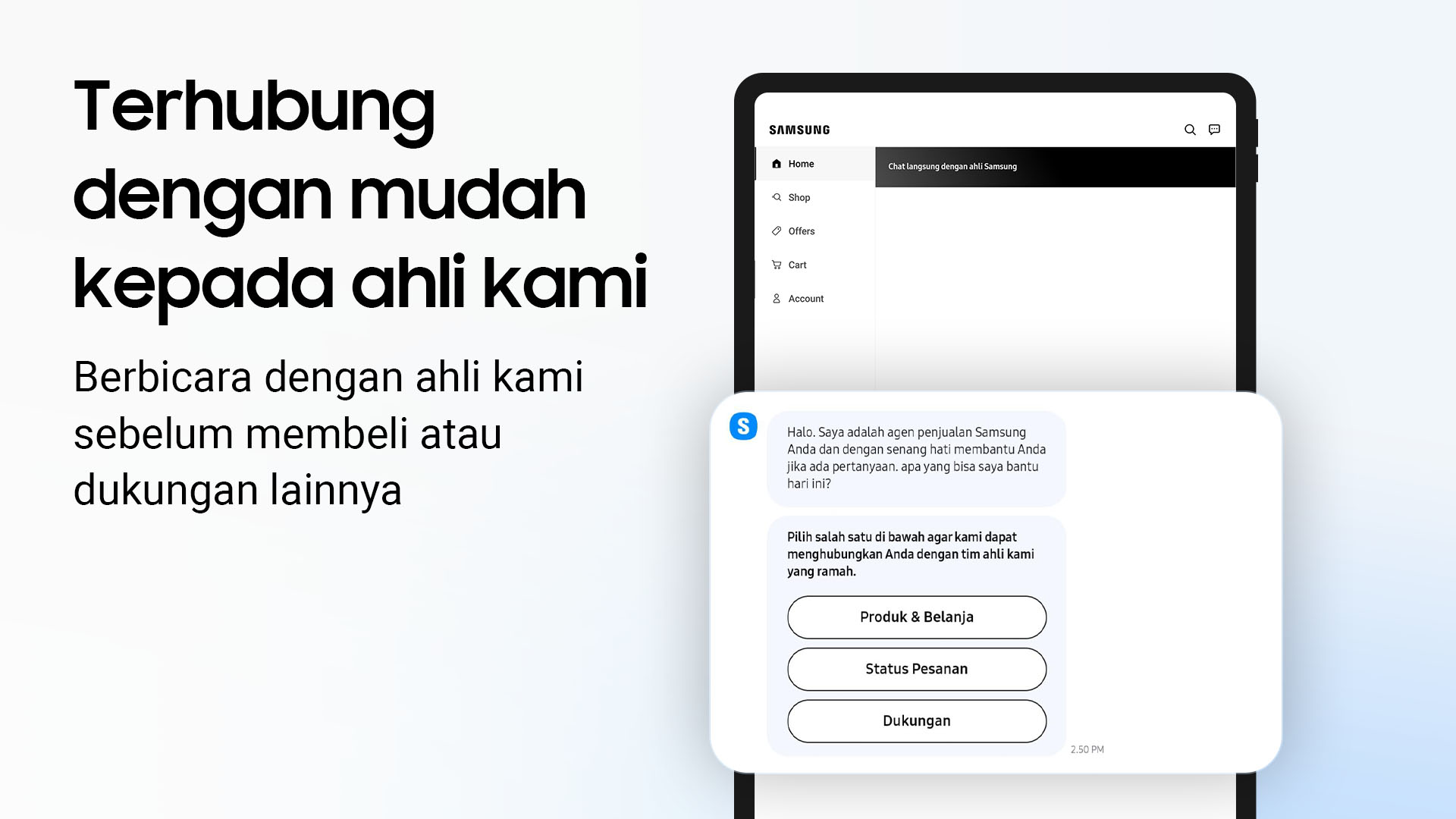 - Kami memiliki dukungan ahli Samsung untuk membantumu atasi berbagai permintaan layanan dengan mudah, termasuk pertanyaan pesanan, perbaikan, integrasi SmartThings, dan pendaftaran produk.