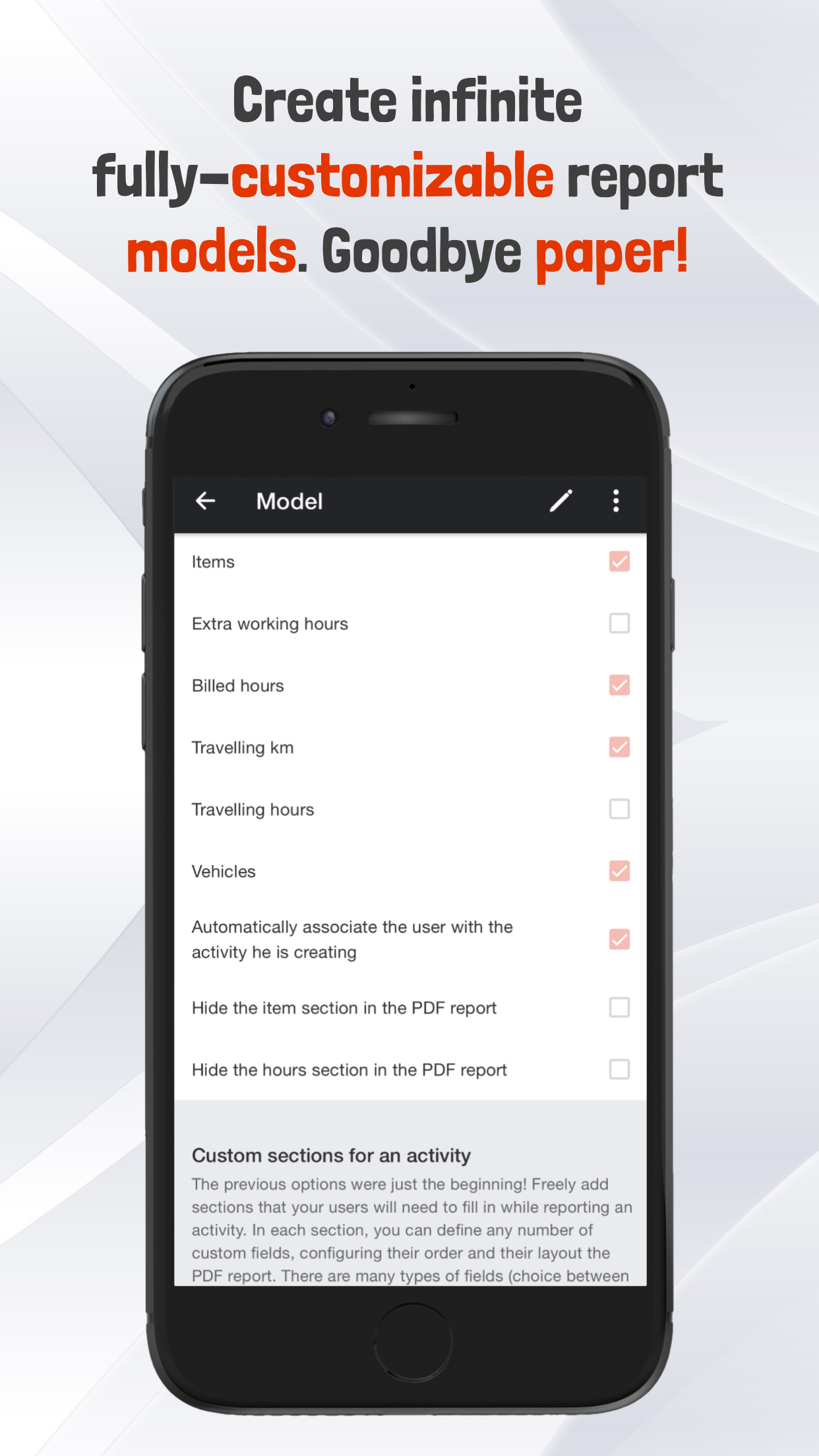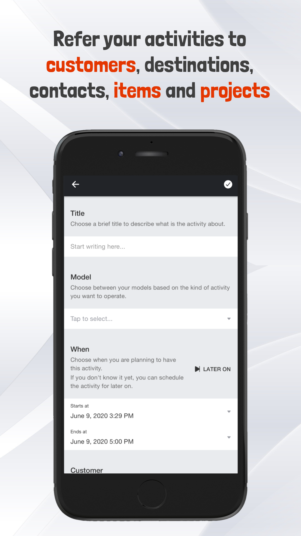 Одной из ключевых особенностей сервиса является возможность планировать и управлять своей следующей деятельностью в повестке дня вместе со своей командой. Вы можете создавать индивидуальные отчеты для ваших вмешательств, определяя различные модели. Вы можете связывать свою деятельность с клиентами, пунктами назначения, контактами, товарами/запасными частями и проектами. Кроме того, вы можете прикреплять ресурсы, изображения, видео и документы к своим отчетам.