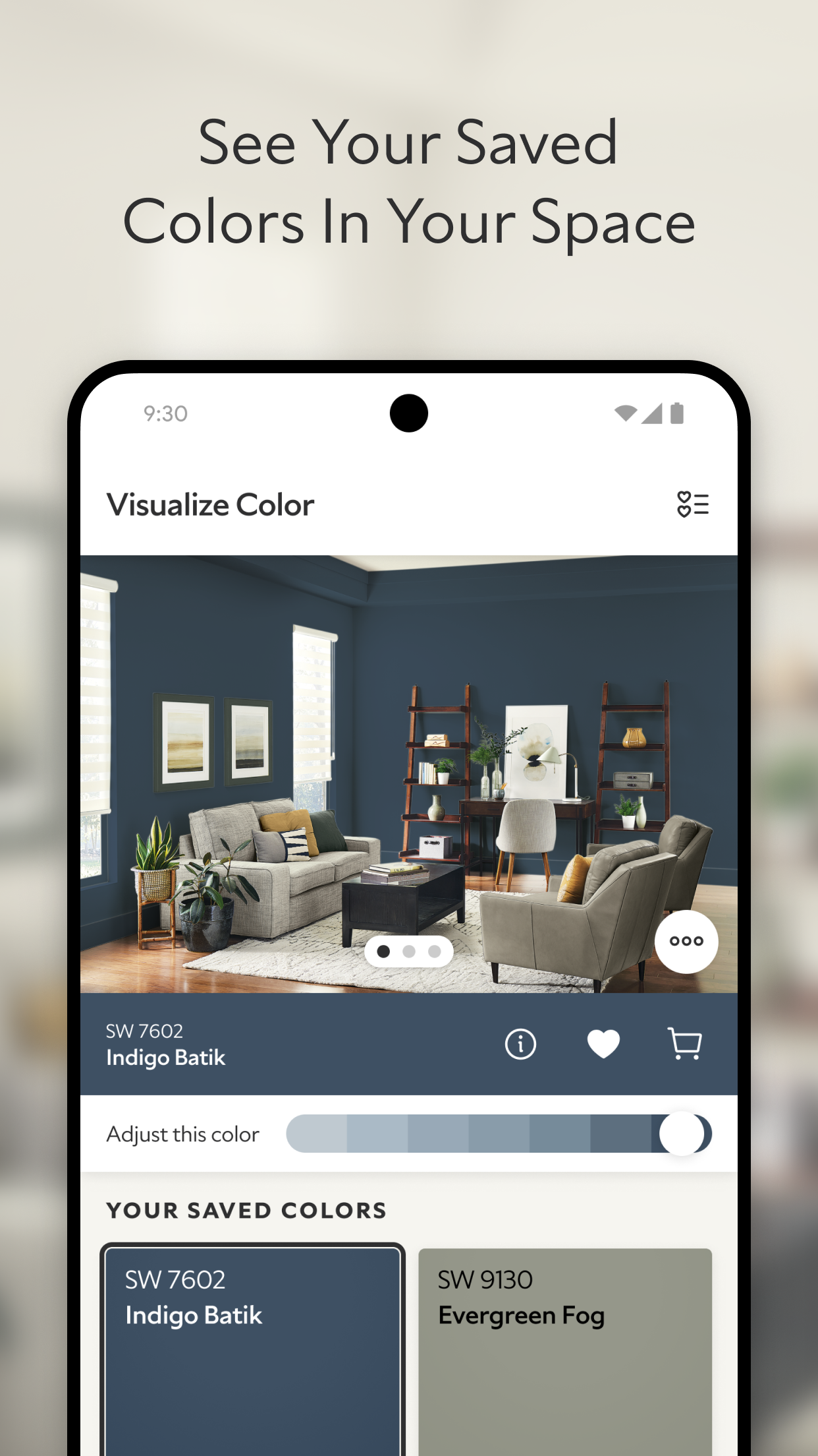 ВИЗУАЛИЗАТОР ЦВЕТА. Наш визуализатор цвета позволяет мгновенно исследовать и визуализировать цвета в вашем пространстве. Сфотографируйте свое пространство и посмотрите, как любой цвет Sherwin-Williams® будет смотреться на ваших стенах. Этот интуитивно понятный визуализатор цвета поможет вам обрести уверенность в выборе цвета, прежде чем вы возьмете в руки кисть.
