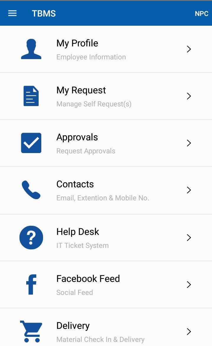 TBMS предоставляет такие функции, как «Профиль сотрудников», «Управление и одобрение запросов сотрудника», «Контактная книга», «Служба поддержки ИТ», «Facebook-канал» и другое средство.
