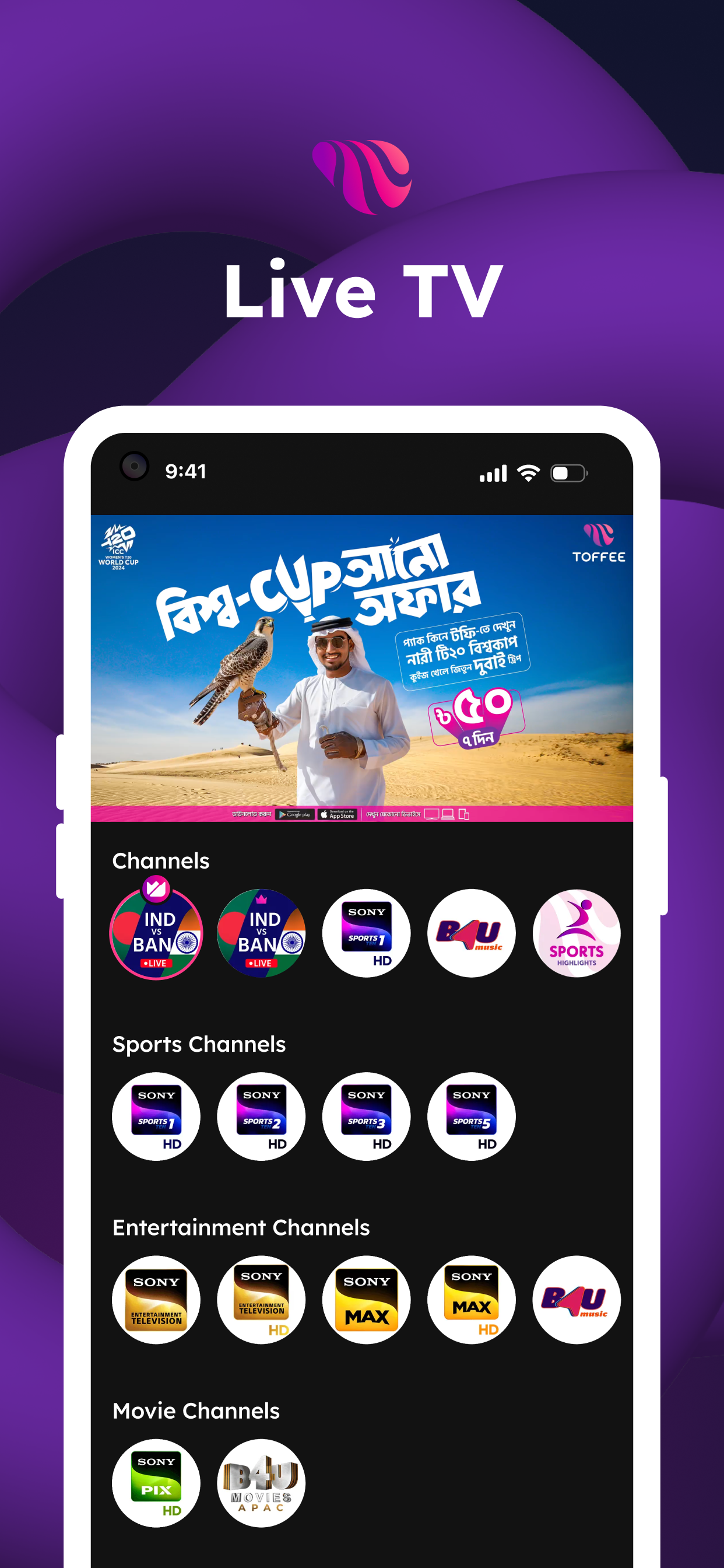 Транслируйте спортивные трансляции, телепередачи, фильмы и веб-сериалы на Toffee — в любое время и в любом месте!
