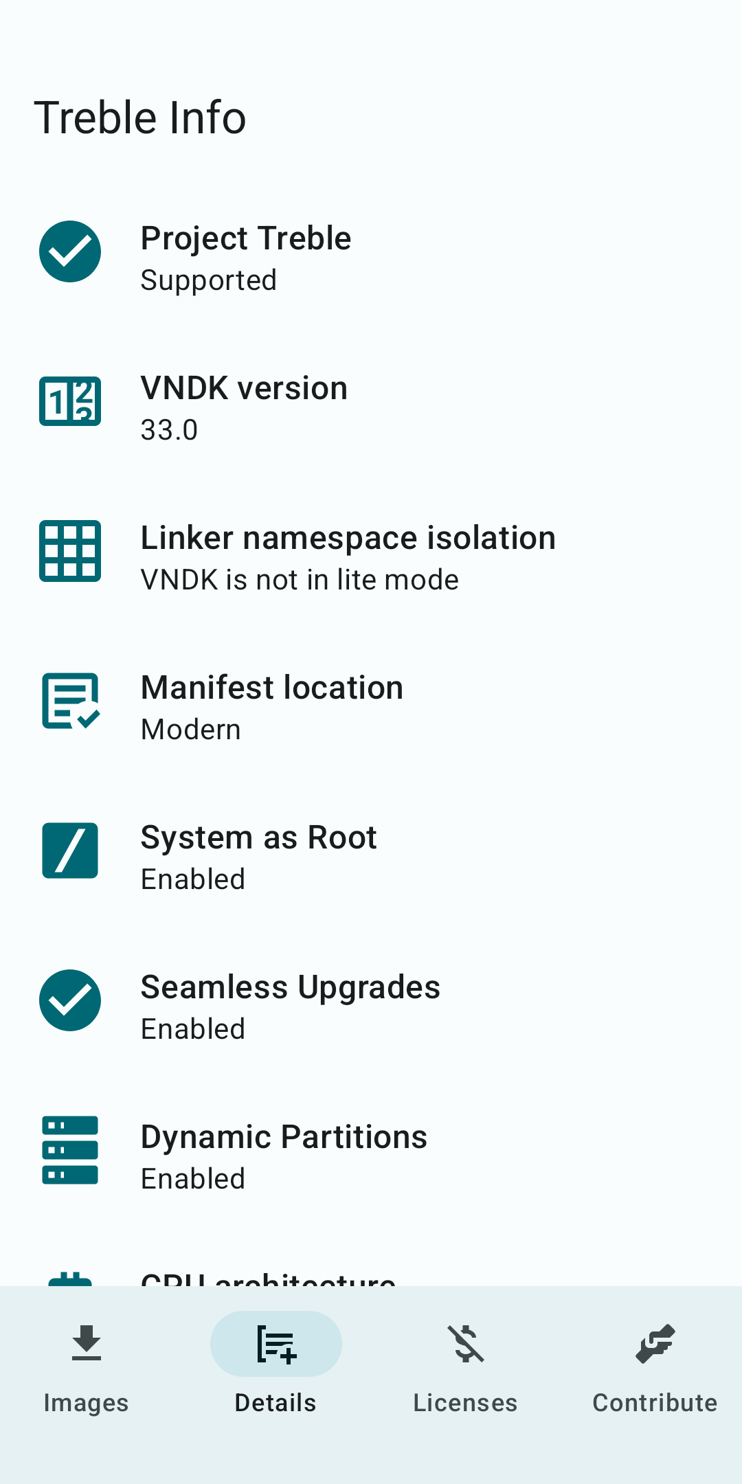 Это приложение позволяет проверить соответствие требованиям для установки Treble GSI и определить корректный тип GSI образа для вашего устройства.