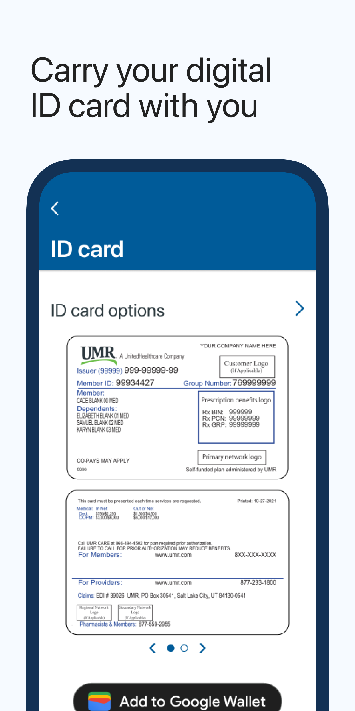 • Доступ к своей цифровой идентификационной карте. Быстро делитесь информацией о своем страховом покрытии со своими поставщиками медицинских услуг, заказывайте новую идентификационную карту или добавляйте ее в свой цифровой кошелек.