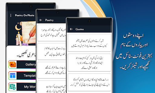 Приложение Urdu on Photo и Poster Maker с приложением Urdu Editor пытается предоставить вам лучшие функциональные возможности. С помощью этой функции вы можете использовать свой любимый стиль шрифта, цвета фона, стикеры и лучшие смайлики из разных вариантов. С помощью стильных шрифтов, наклеек и смайликов сделайте свой пост, поэзию на урду в картинках и миниатюры видео красивыми. Создатель политических плакатов с редактором фотографий и постеров.