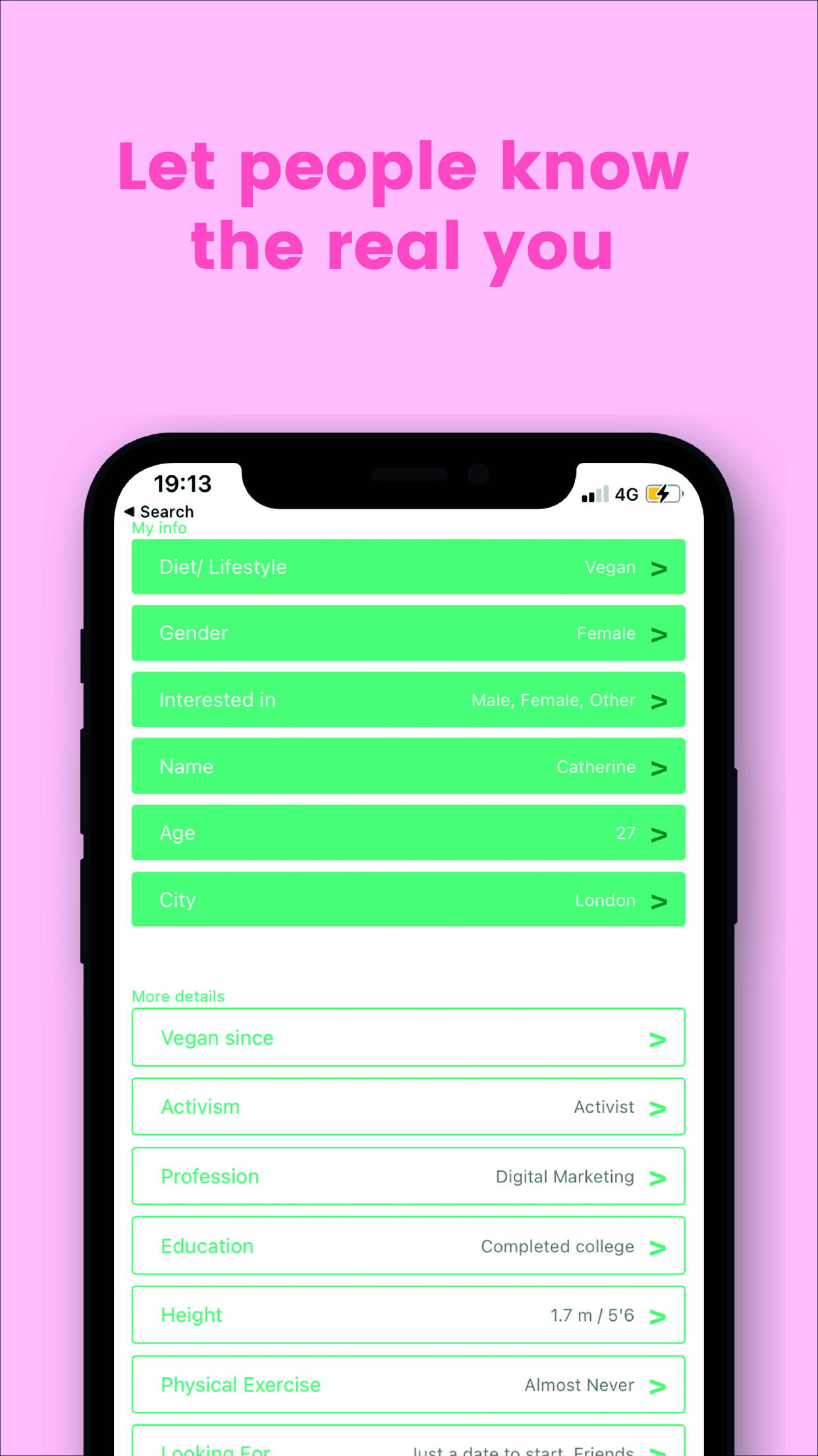 Намного лучше встречаться с человеком, который думает и ест, как вы. Вы можете спокойно разделить трапезу и хорошо провести время, зная, что вы согласны с такими важными вещами, как спасение животных, защита окружающей среды и здоровый образ жизни. Отношения с невегетарианцами, как правило, всегда наталкиваются на некоторые препятствия, которых, как мы считаем, можно вообще избежать, если вы найдете правильный вегетарианский союз. Устали встречаться с кем-то в ресторане и объяснять, откуда вы получаете белки, или почему коровы и рыбы такие же живые существа, как собаки? Или, может быть, вы просто хотите встретить единомышленников, чтобы весело поговорить или обменяться веганскими рецептами. В любом случае, именно поэтому мы создали Veggly! Находите, сопоставляйте и общайтесь с вегетарианцами и веганами рядом с вами!