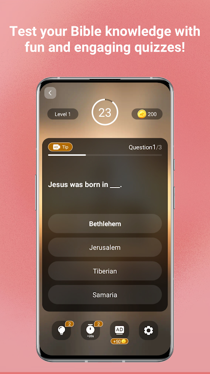 Функция викторины позволяет пользователям проверить свои знания Священного Писания, задавая вопросы на различные библейские темы. Пользователи могут углубить свое понимание Священного Писания, наслаждаясь веселым и увлекательным процессом обучения.