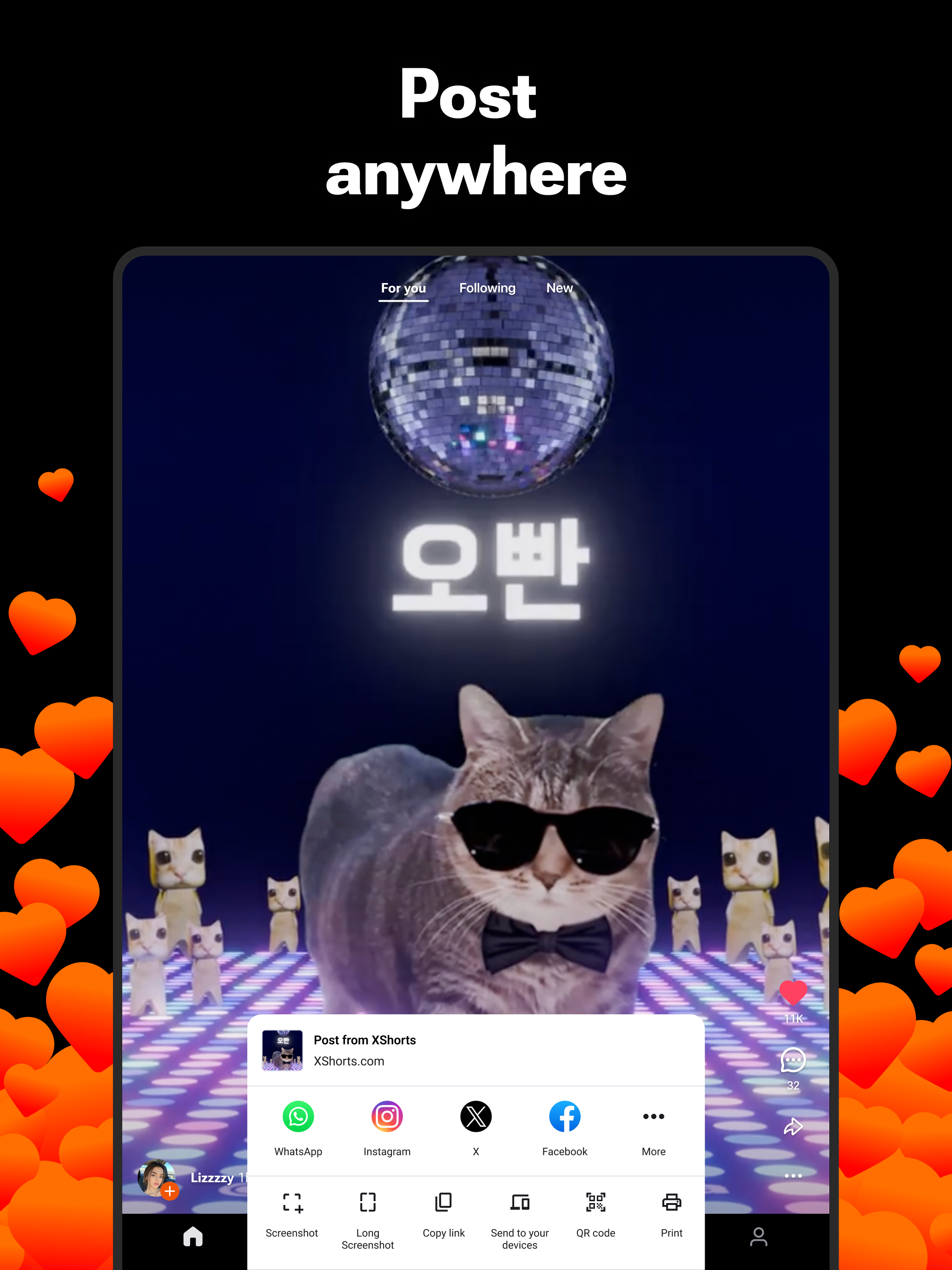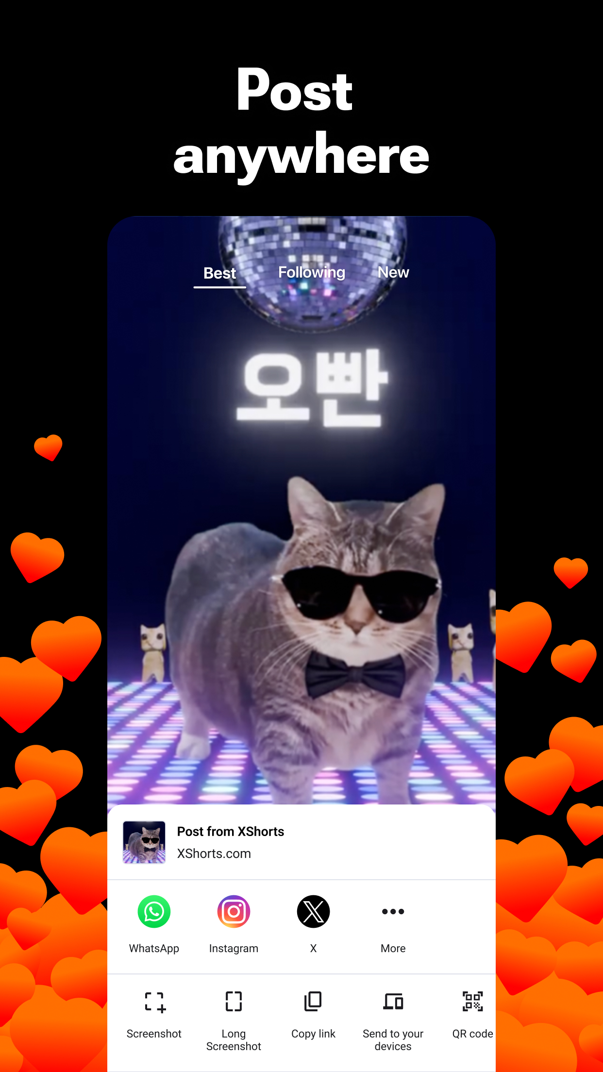 • Создайте свой собственный: раскройте свой творческий потенциал с помощью нашего встроенного фото- и видеоредактора. Создавайте собственные короткие видеоролики и делитесь своей уникальной точкой зрения с сообществом XShorts. Будь то забавный клип, развлекательная гифка или умный мем — возможности безграничны! Используйте наш видеоредактор, чтобы создавать потрясающие видеоролики, передающие суть вашего юмора.