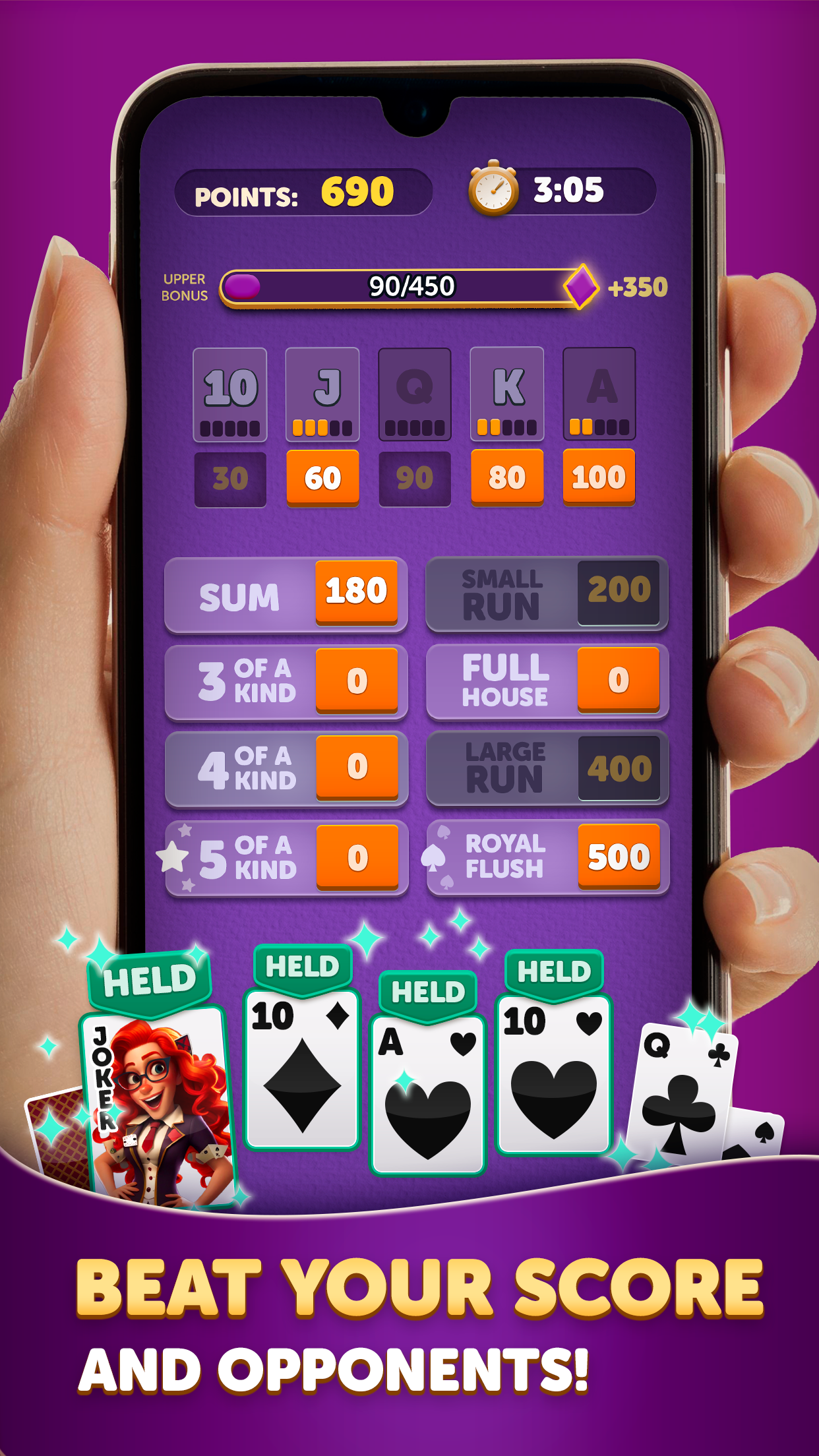 Добро пожаловать в Yatzy Cards, идеальное сочетание классического Yatzy и стратегической карточной игры! Бросьте вызов друзьям и игрокам со всего мира в захватывающих карточных дуэлях. Готовы ли вы стать мастером ятзи?