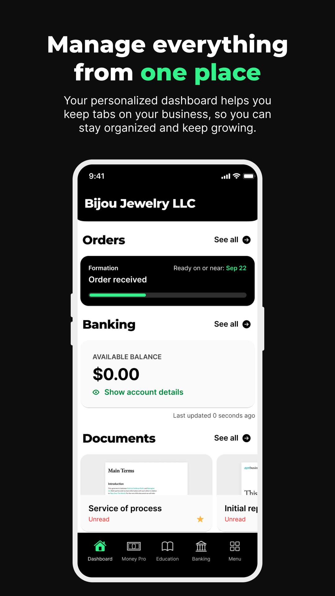 Управляйте своим бизнесом как босс, и все это из одного приложения. Отслеживайте статус своего образования, отмечайте деловые расходы, получайте доступ к документам для соответствия требованиям, общайтесь с нами для получения поддержки и т.д.