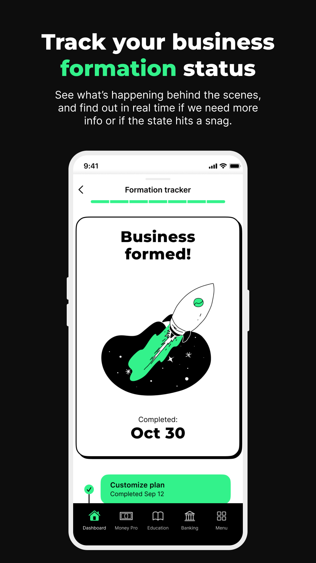Используйте наш трекер формирования, чтобы отслеживать статус вашего нового ООО или корпорации. Посмотрите, что происходит за кулисами, и узнайте в режиме реального времени, нужна ли нам дополнительная информация или если штат сталкивается с проблемой.